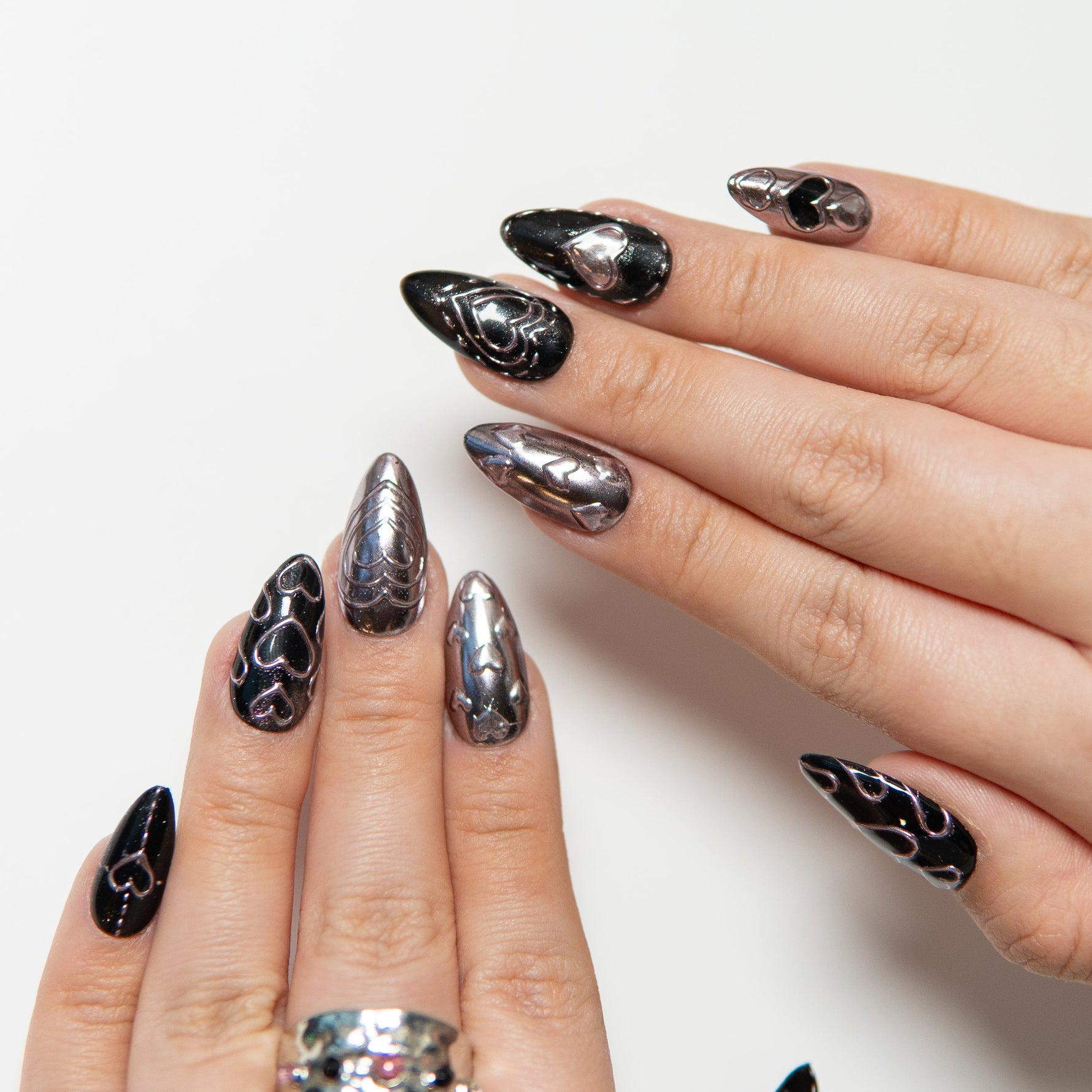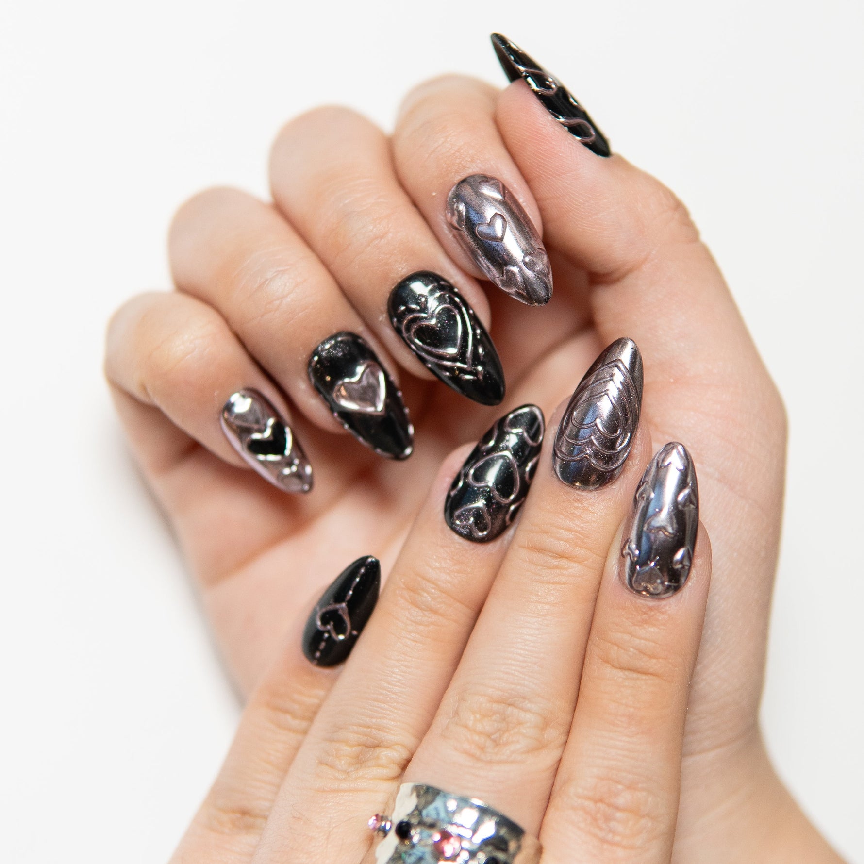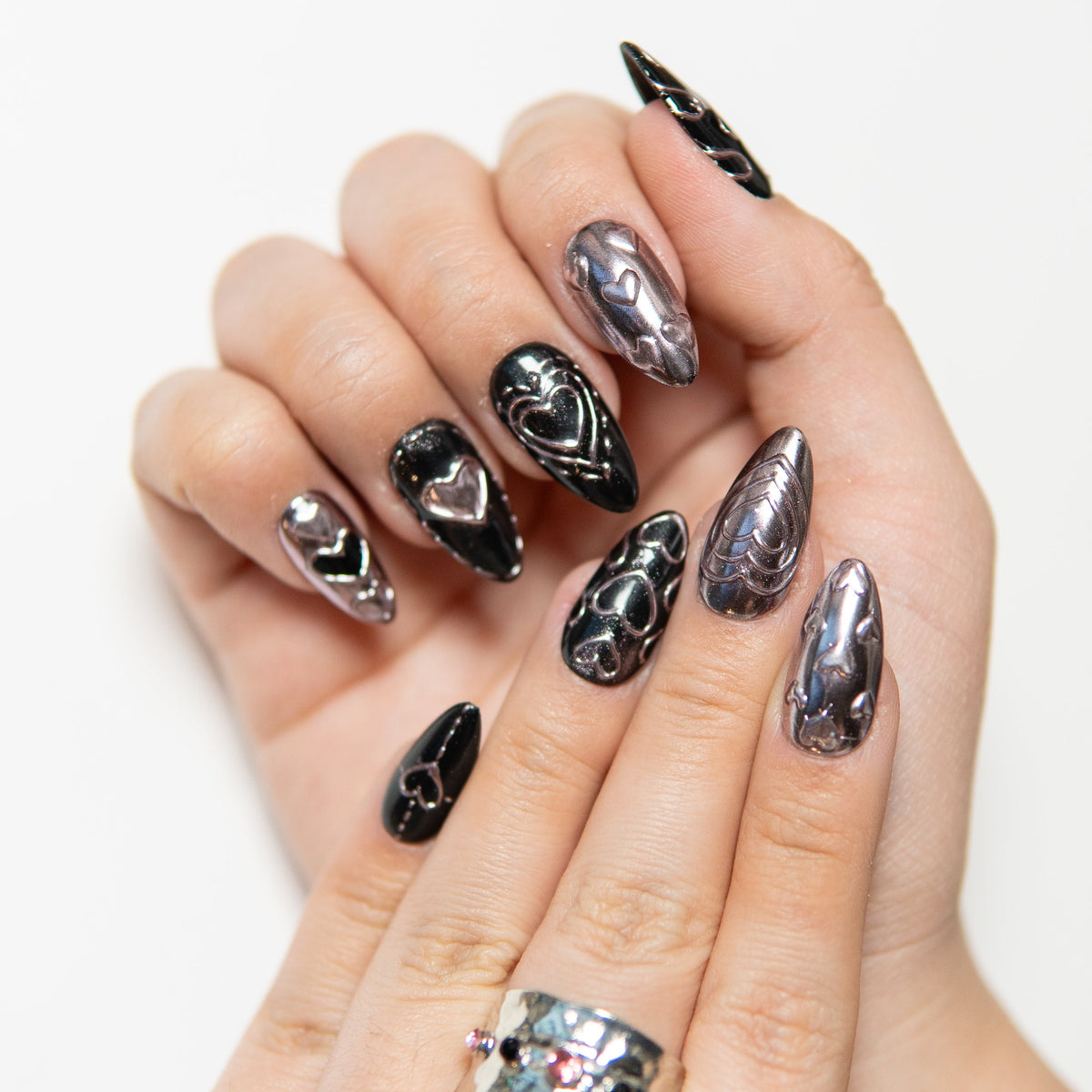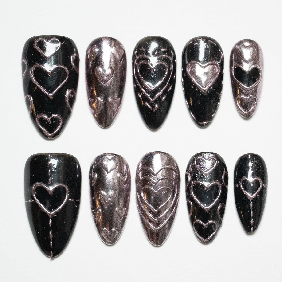 Cœur Noir incarne une féminité sombre et assumée.Le contraste entre le fond noir brillant et les formes cœur métalliques crée une silhouette forte, presque hypnotique.Ni trop girly, ni trop gothique — ce design affirme une attitude.