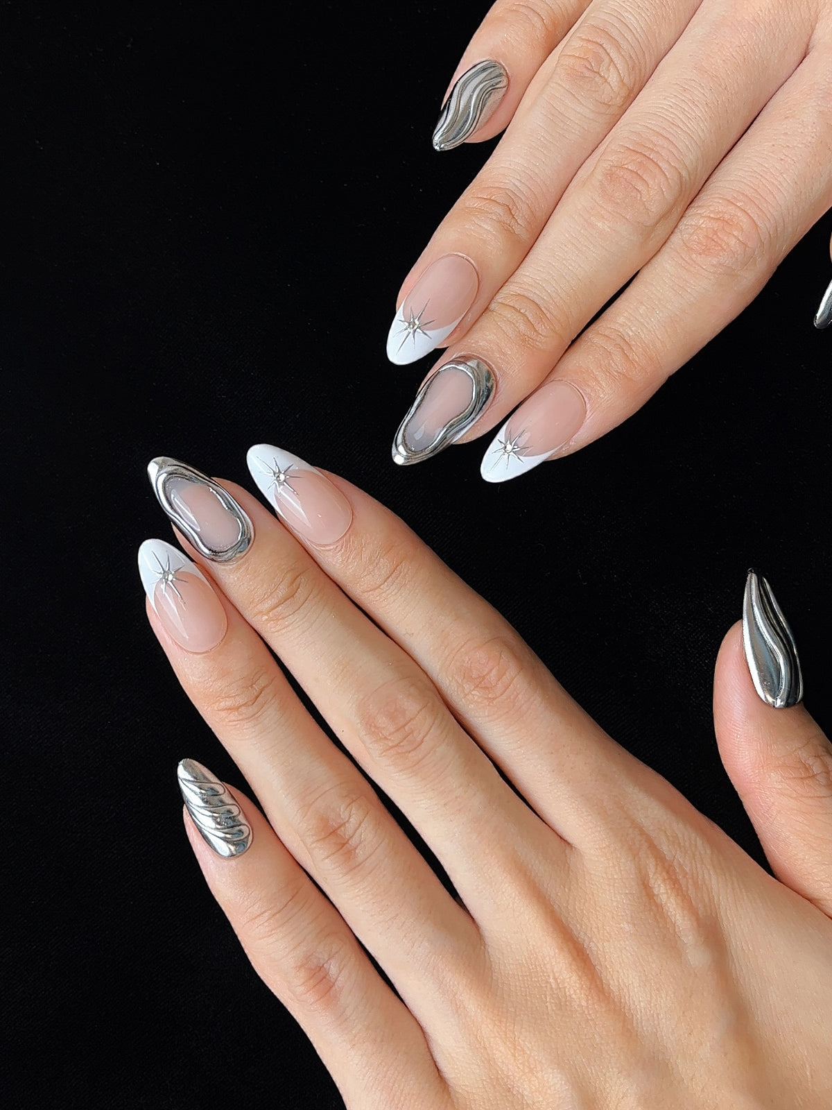 Argent et nude se fondent comme une lumière silencieuse sous la nuit.